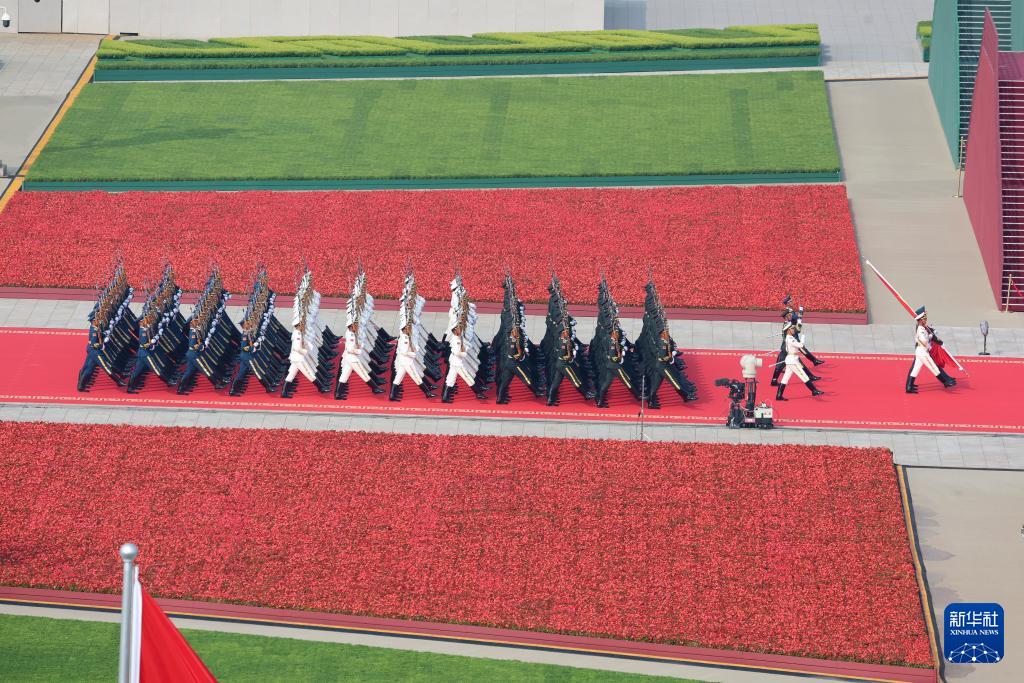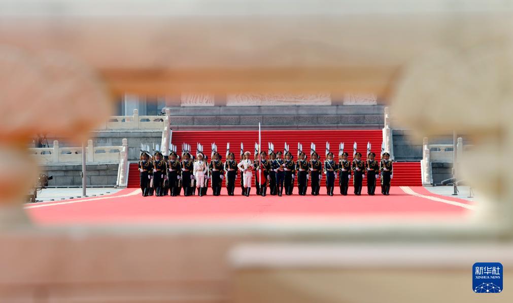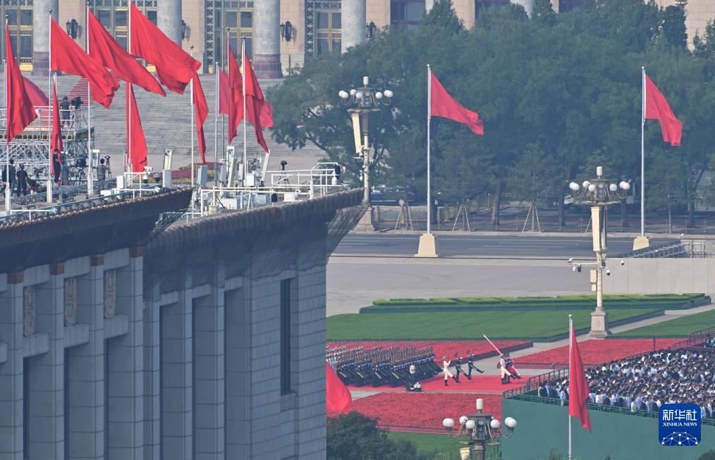 9月3日,纪念中国人民抗日战争暨世界反法西斯战争胜利80周年大会在北京隆重举行。这是国旗护卫队官兵护卫着五星红旗,从人民英雄纪念碑行进至广场北侧升旗区。