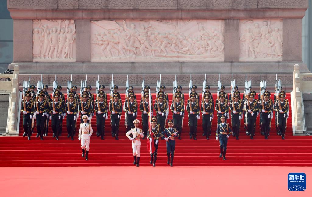 9月3日,纪念中国人民抗日战争暨世界反法西斯战争胜利80周年大会在北京隆重举行。这是国旗护卫队从人民英雄纪念碑基座出发,走向旗杆基座。