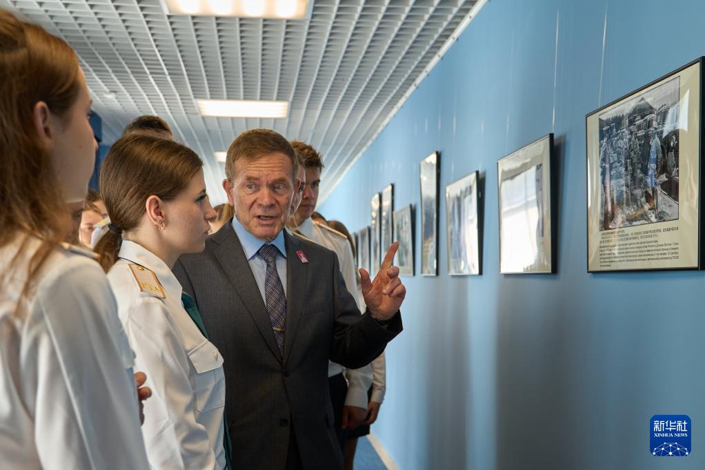 9月2日,在俄罗斯符拉迪沃斯托克举办的“百炼成钢的真心朋友”——纪念中国人民抗日战争暨世界反法西斯战争胜利80周年图片展上,老师为学生讲解。