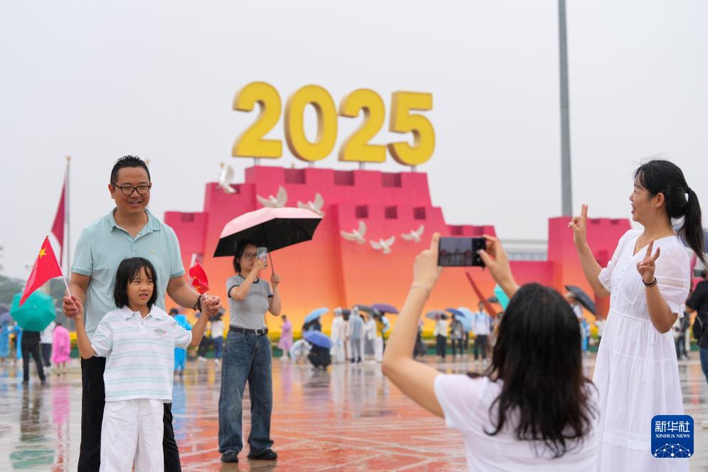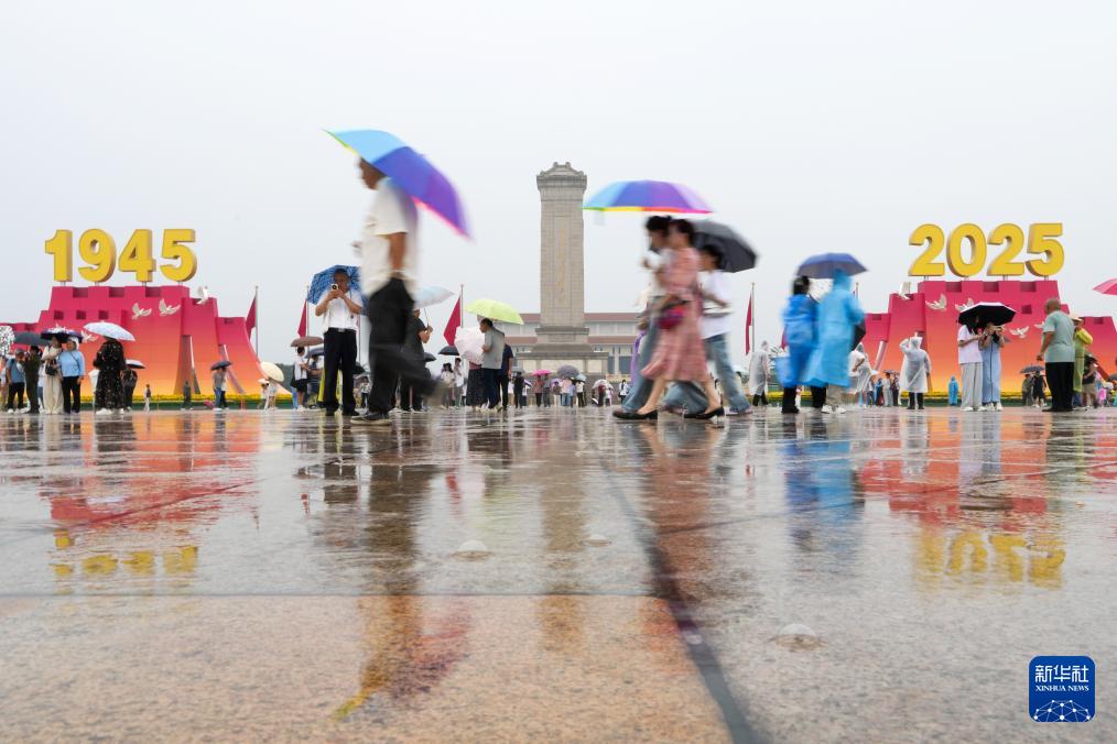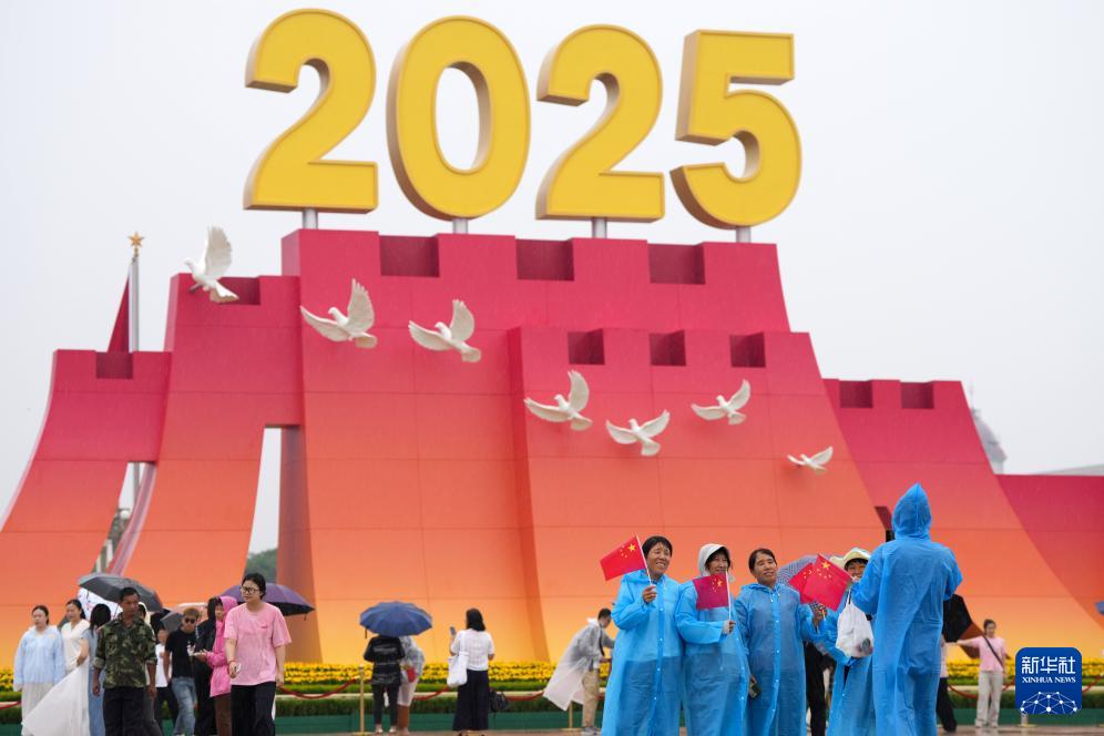 9月5日,天安门广场上,众多市民游客在纪念中国人民抗日战争暨世界反法西斯战争胜利80周年大会的标志性景观前参观游览。