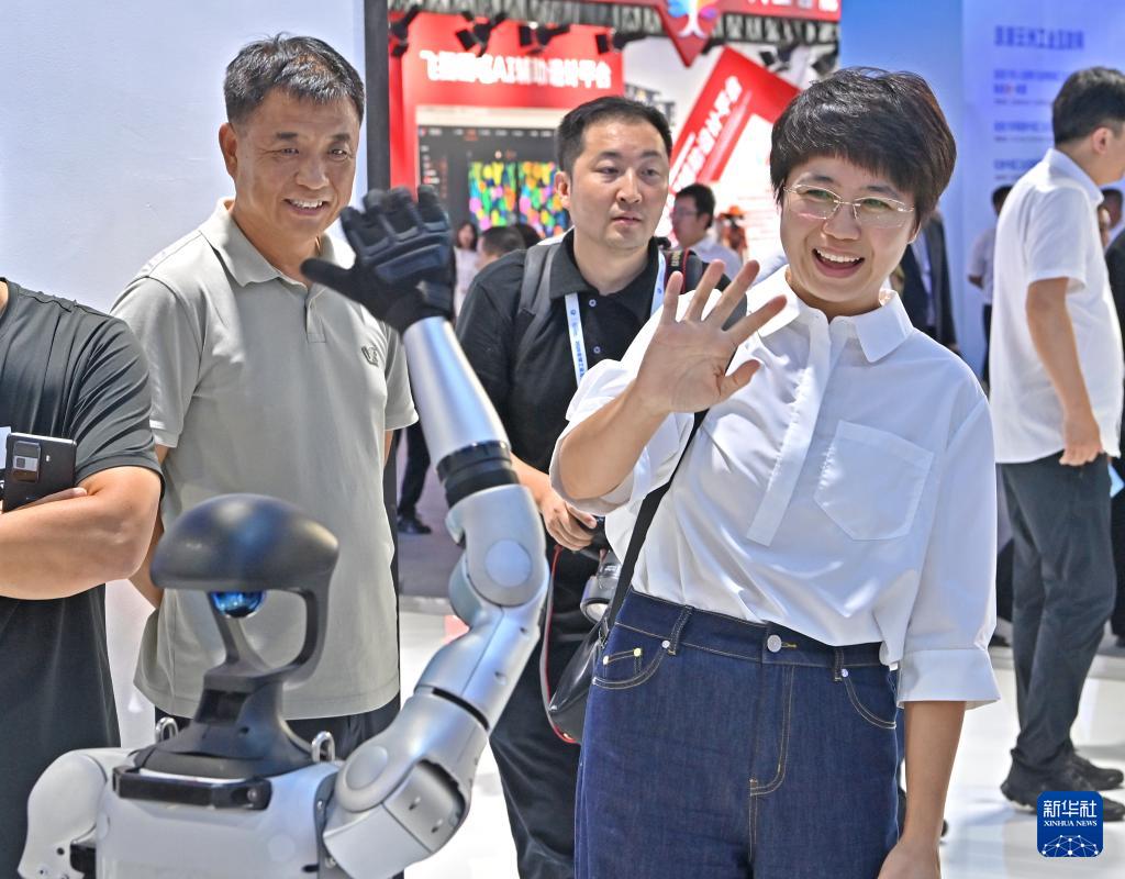 9月6日,观众在2025全球工业互联网大会现场与机器人互动。