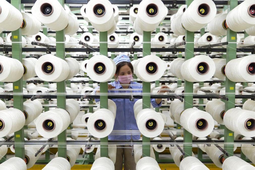 在中国平煤神马集团帘子布发展公司布机车间,工作人员在检查丝线生产情况。新华社记者 李嘉南 摄