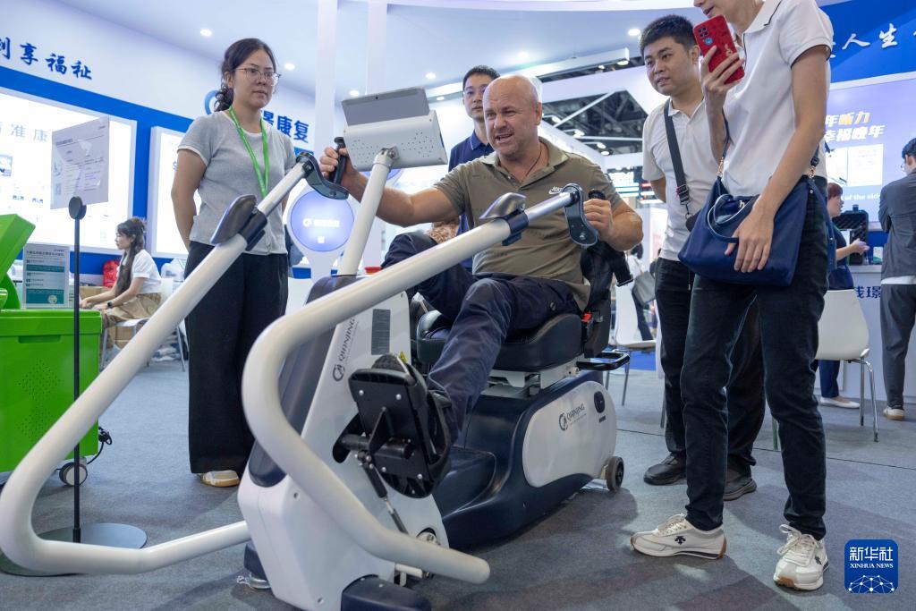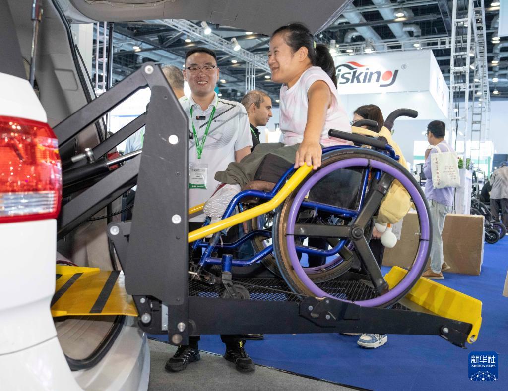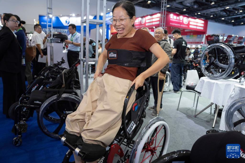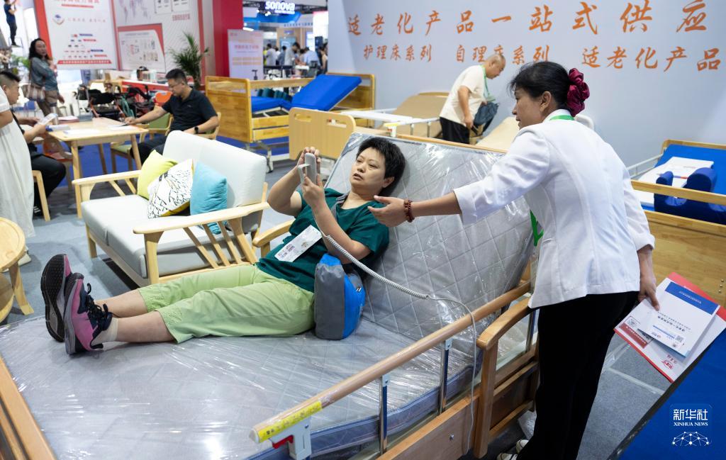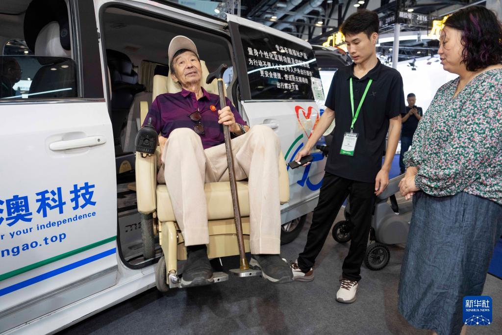 9月12日,参观者在明澳科技展台体验分离式福祉座椅。