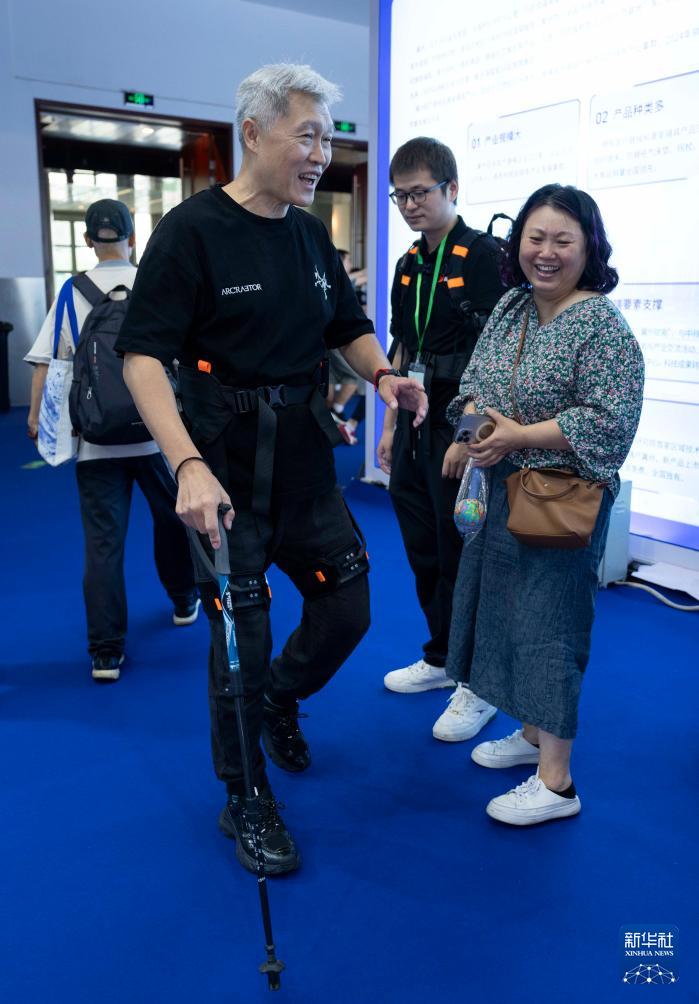 9月12日,参观者在大湾区辅助器具创新中心展台体验行走助力机器人。