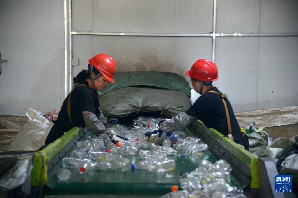 在位于福州马尾区的福州城投再生资源分拣中心,工人整理智慧光选机筛选后的可回收垃圾(9月13日摄)。