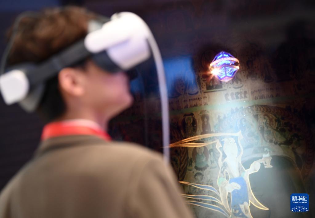 9月17日,与会嘉宾在论坛的文化遗产数字化精品项目展上体验敦煌研究院《寻境敦煌》项目。