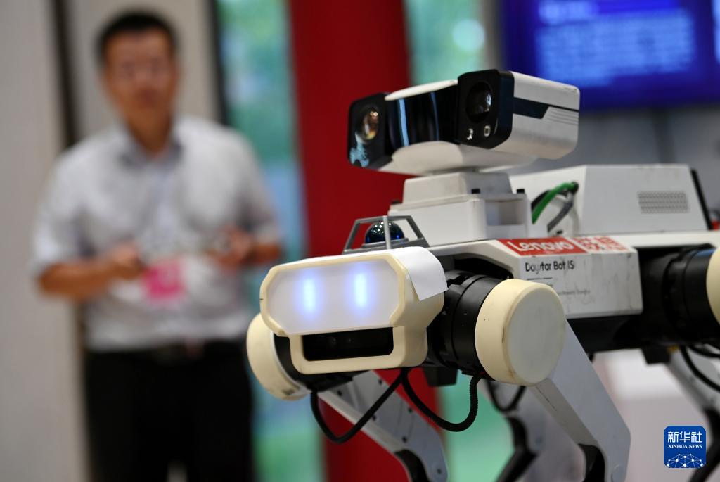 9月17日,工作人员在论坛的文化遗产数字化精品项目展上操作展示应用于应县木塔数字化保护项目的联想晨星六足机器狗。