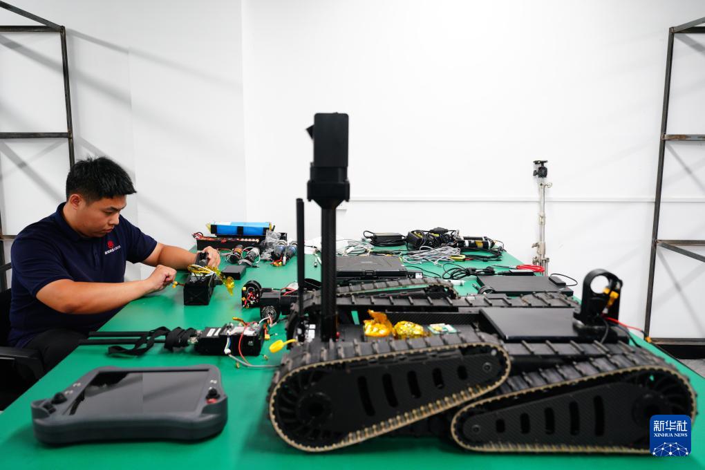 9月20日,河北省邢台市柏乡县一家机器人科技公司的员工在对地震搜索机器人进行自主导航训练。