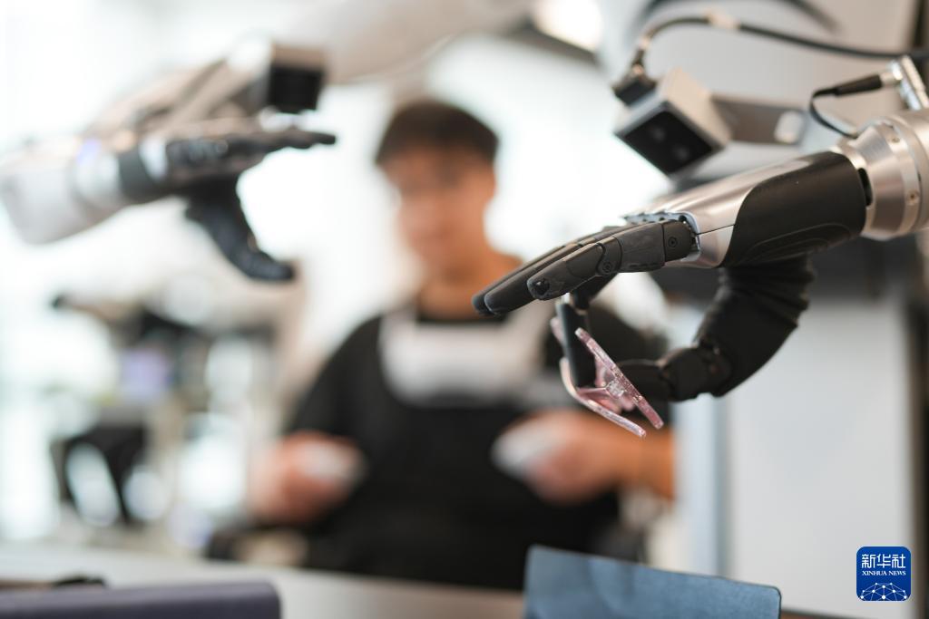 9月23日,工作人员在专用场景采集区操作机器人收放眼镜。