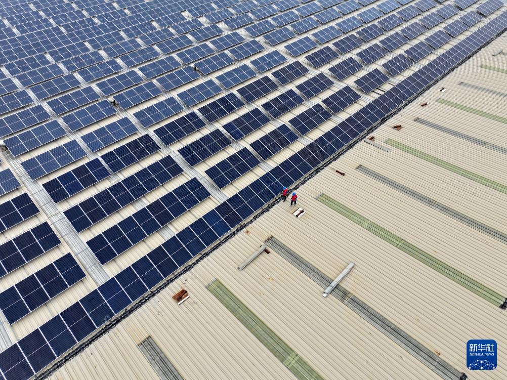 9月24日,国网泊头市供电公司工人在当地一家铸造企业屋顶巡检光伏发电设备。