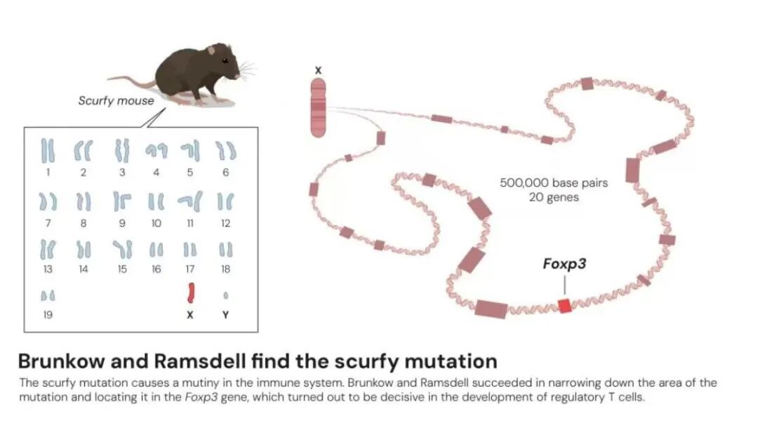 因此,他们决定寻找坏血病小鼠的突变基因。不过,这在20世纪90年代就像大海捞针一样极为困难,因为小鼠中X染色体的DNA是由约1.7亿个碱基配对核苷酸组成。经过大量的艰苦研究和基因检测,最后他们找到了导致坏血病的基因Foxp3基因。这个基因不只是以前未知的,而且与一组称为叉头盒(FOX)的基因有许多相似之处。这些基因调节其他基因的活性,从而影响细胞发育。