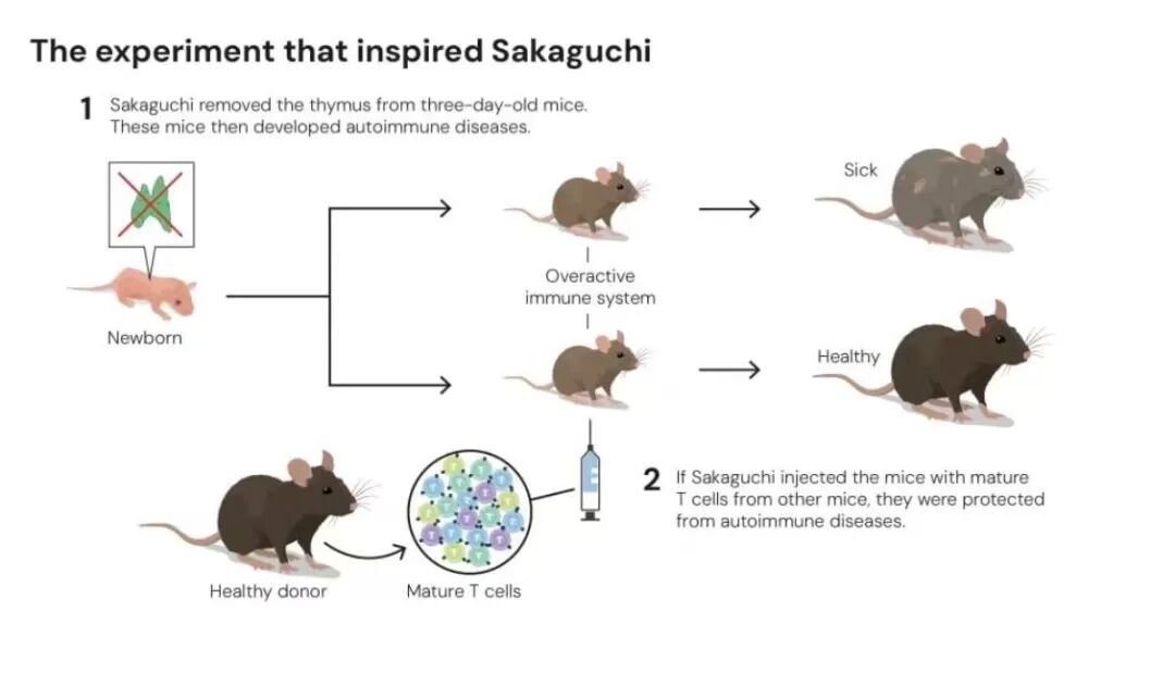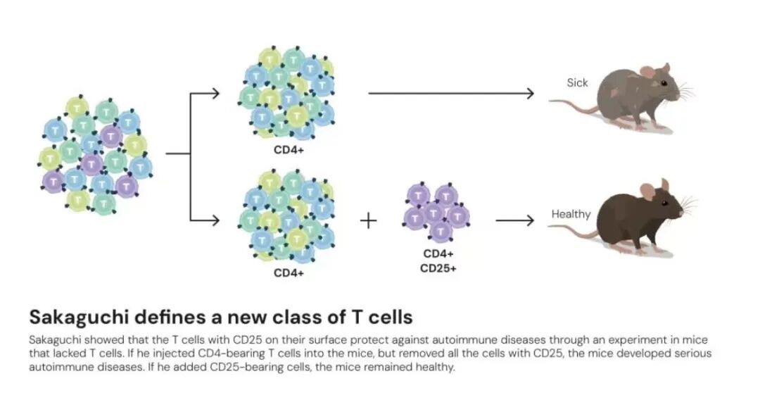 日本名古屋的爱知县癌症中心研究所的坂口志文于1995年在《免疫学杂志》上首先发表研究结果,宣称发现了一类全新的T细胞,其特征在于其表面携带CD4受体,同时还携带一种称为CD25的受体(蛋白质)。坂口志文设计了一个对小鼠的精巧的实验,证明小鼠的表面带有CD4和CD25两种蛋白的T细胞是控制自身免疫反应的“开关”。把健康小鼠体内的这些细胞移除后,小鼠患上了严重的自身免疫病;反之,把这些细胞输回病鼠体内,则阻止了疾病。
