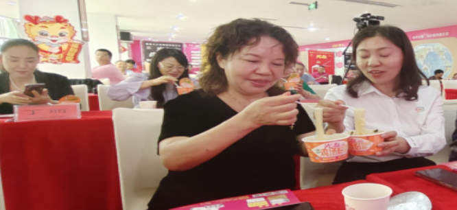 “嗦粉大赛,现在开启!”主持人话音刚落,数十名参赛嘉宾迅速上场,面前摆放着光友低Gi酸辣粉;台下嘉宾席,工作人员同步端上光友酸辣粉mini杯,台上台下形成“同步嗦粉”的热闹场景。哨声响起,台上选手专注角逐,有人用筷子高高挑起粉丝、有人用筷子快速卷粉入口、有人小口快咽确保汤汁不洒,全程严守“用时最短、碗底无汤”标准;台下嘉宾边品尝边关注比赛,偶尔与身旁人交流:“你试试这个酸辣粉,嚼着有红薯的绵甜”“酸辣粉的红油飘香”,轻声讨论与台上的细微吞咽声交织,氛围鲜活。