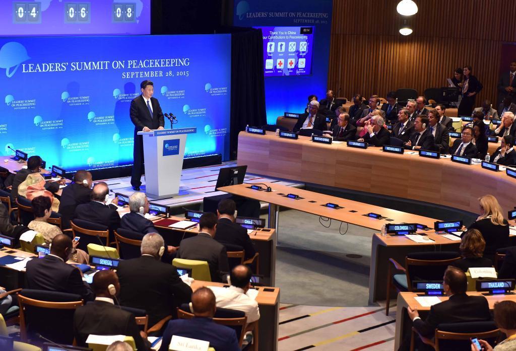 2015年9月,习近平总书记在纽约联合国总部出席联合国维和峰会并发表讲话。新华社记者 李涛 摄