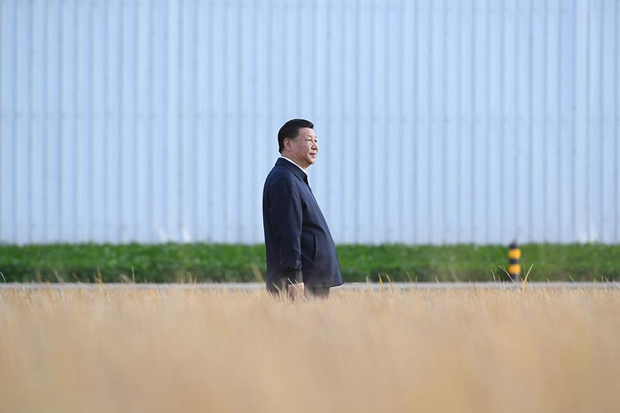 2018年9月25日,中共中央总书记、国家主席、中央军委主席习近平抵达黑龙江省开始考察。这是习近平在黑龙江农垦建三江管理局了解粮食生产和收获情况。新华社记者 燕雁 摄