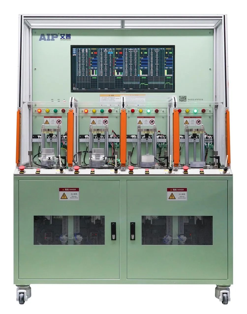 针对这一需求,艾普智能组建专业团队,经深入技术论证后,定制开发了一套四工位并行测试系统。该系统采用四工位同步测试设计,能够实现高效并行测试,可一次性完成负载测试、霍尔特性、反电动势、转速、转向、缺相、交流耐压、绝缘电阻等多项测试项目,大幅提升测试效率。基于模块化设计,一套设备即可满足直流电机与交流电机的测试需求,显著降低客户设备采购与管理成本。此外,智能化管理方面,该设备支持与工厂MES系统对接,具备远程诊断和软件升级功能,可实现测试数据的实时上传与分析,快速响应客户需求。