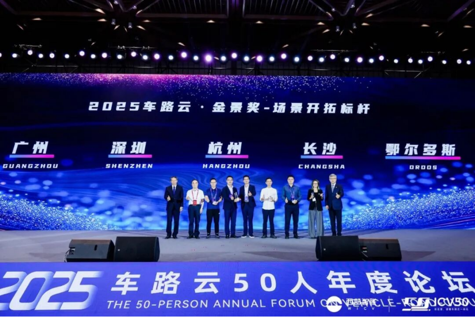 获得“2025车路云·金景奖”的城市有:广州、深圳、杭州、长沙、鄂尔多斯。
