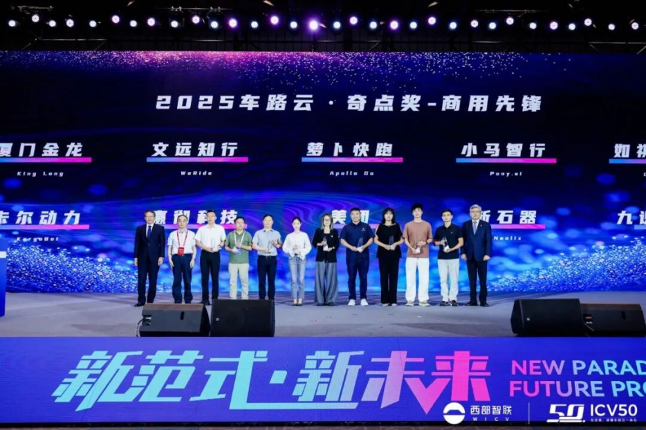 获得“2025车路云·奇点奖”的企业有:厦门金龙、文远知行、萝卜快跑、小马智行、如祺出行、卡尔动力、嬴彻科技、美团、新石器、九识智能。