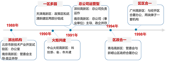1988年,国务院批准实施火炬计划,明确把创办高新区作为火炬计划的重要内容;同年,批准建立第一个国家高新区——北京市新技术产业开发试验区(以下简称“北京试验区”),也就是中关村科技园区的前身,批准颁布《北京市新技术产业开发试验区暂行条例》,拉开了我国建设国家高新区的序幕。北京市政府根据该《暂行条例》发布实施细则,明确规定北京市试验区办公室是海淀区人民政府的派出机构 ,在海淀区人民政府领导和市科委指导监督下,具体办理新技术企业的审批核定事宜。同年7月,为加强对北京试验区的领导和协调工作,北京市政府牵头组建了北京试验区协调委员会 ,由北京市副市长任委员会主任,北京试验区办公室兼协调委员会办公室职能。北京试验区的建设模式为后来国家高新区组建领导小组,成立作为政府派出机构的管委会奠定了重要基础。在中关村科技园区成功探索的基础上,1991年和1992年,国务院先后批准建立了51家国家高新区,全面启动国家高新区建设。为贯彻落实党中央、国务院的指示精神,1991年,原国家科委和国家体改委研究制定了《关于深化高新技术产业开发区改革,推进高新技术产业发展的决定》,进一步明确了国家高新区改革的基本方向、原则和思路,明确国家高新区要根据发展社会主义有计划商品经济的要求,建立起符合商品经济运行规律,适应高新技术产业发展要求和国际惯例的体制、机制;各开发区要因地制宜地建立决策、管理机构,赋予相应的权限,代表当地政府行使行政职权, 统一对内对外,集中有效地协调解决开发区发展中的重大问题,并在工商、税务、财政、金融、国际合作交流、外贸、进出口等方面形成配套、高效的服务功能,为企业提供综合服务。在1988年到2000年的“一次创业”阶段,国家高新区发展到53家,成为我国高新技术的集聚地和成果转化、产业发展的增长极。由于这一阶段高新技术产业发展基础总体薄弱,需要强有力的管理机构创造发展环境,同时借鉴了当时国家经开区的管理经验,大多高新区采取较封闭的管理模式,探索集中授权管理。 初步形成了具有中国特色的“领导小组+管委会+公司” 管理架构,实行“决策层-管理层-服务层” 开放式管理模式。其中,“决策层”即由市政府主要负责人及市政府有关行政管理部门负责人组成的领导小组,为强化政府的作用,一般由市级主要领导担任领导小组组长。主要负责宏观决策、重大政策制定、用地规划、协调解决高新区开发建设及管理过程中的重大问题等。“管理层”即作为政府派出机构的管委会,代表当地政府行使政府职权,对园区实行统一领导,负责具体发展规划、建设和管理等职责。“服务层”即设立园区开发建设公司、创新创业中心等,负责园区基础设施建设、投融资、创业孵化等功能。实践中,各国家高新区也结合自身实际情况,逐步探索适宜区域特征、顺应市场经济发展的多样化管理体制 。如南京高新区创建初期采取以管委会为主导的政企并存模式;海南高新区、深圳高新区采取以企业、总公司为主导的管理体制;桂林高新区由具有一定行政职能的事业单位来实行企业管理;中山、厦门和威海三个国家高新区,由原国家科委、省科委和当地政府合办,被命名为火炬高新区,在行政管理的基础上,成立开发总公司,负责高新区基础设施建设、新技术产业投资和部分公共事务管理。