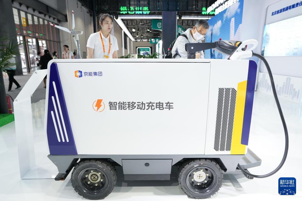 9月14日,参观者在首钢园环境服务专题展区参观智能移动充电车。
