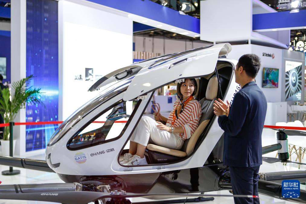 9月12日,参会者在服贸会国家会议中心会场参观亿航无人驾驶载人电动垂直起降航空器。