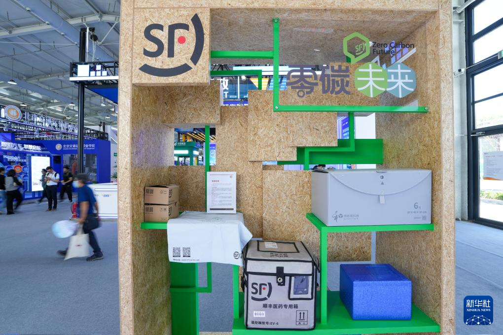 首钢园供应链及商务服务专区的顺丰公司展台上展出的环保快递包装(9月14日摄)。
