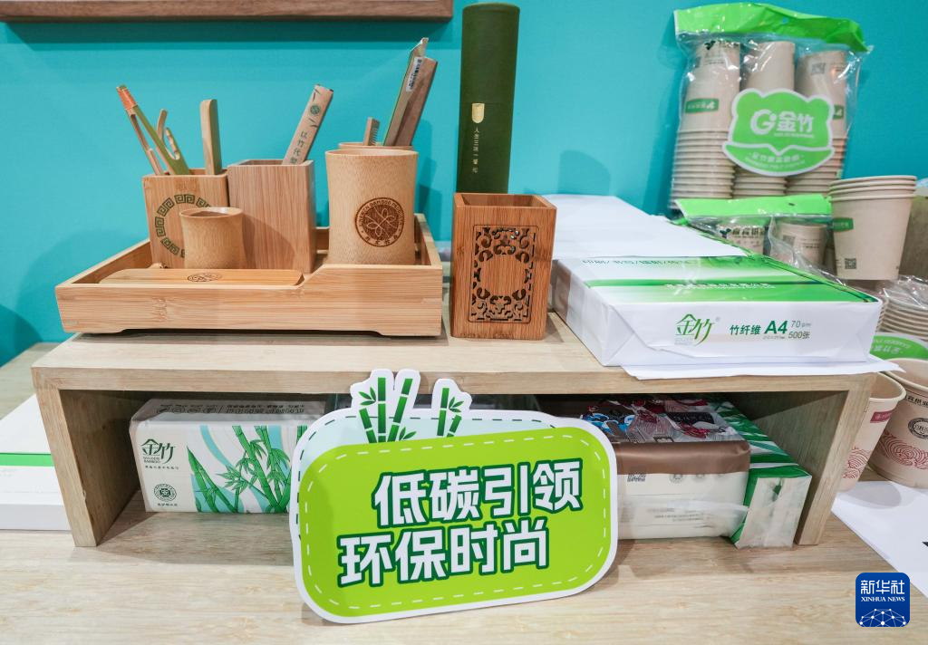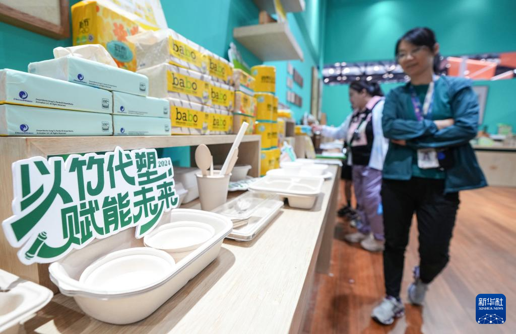 9月14日,参观者在服贸会国家会议中心的国际竹藤组织展位参观。
