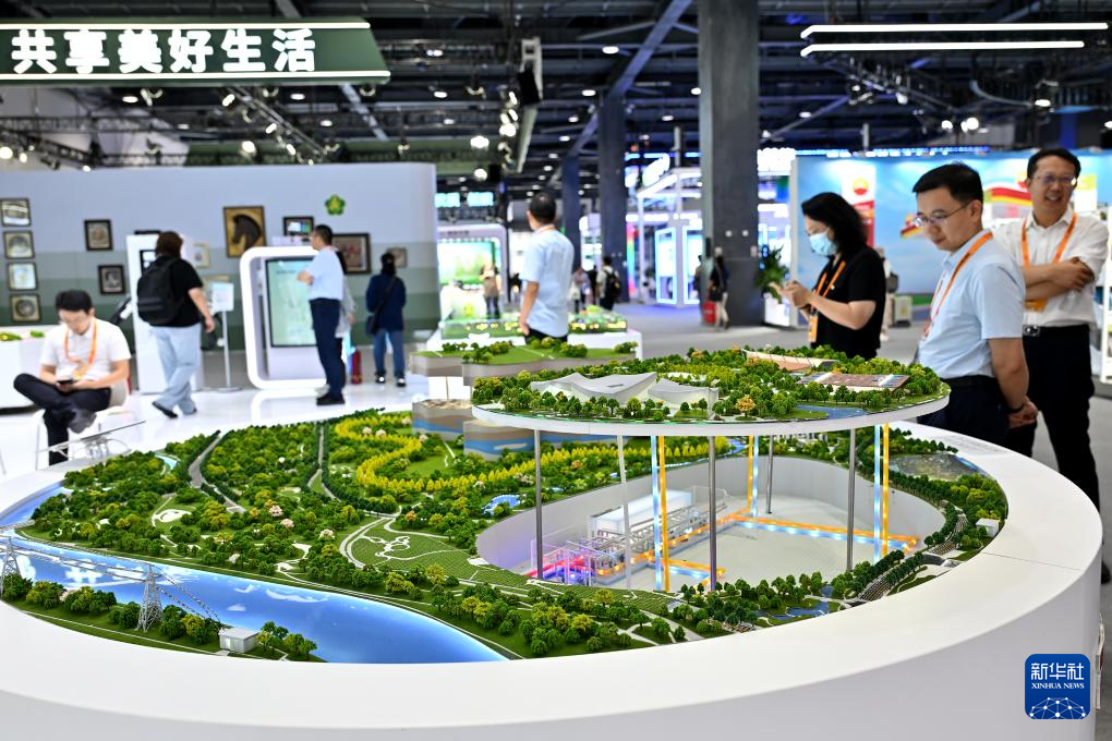 9月14日,参观者在服贸会首钢园区北京节能环保中心展台观看北京城市绿心绿色低碳转型案例展示沙盘。