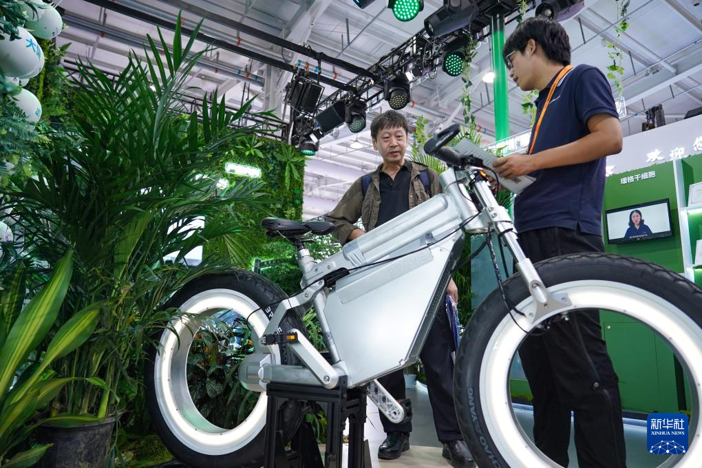 9月13日,参观者在服贸会国家会议中心综合展区参观展出的无辐式超级氢能摩托车。