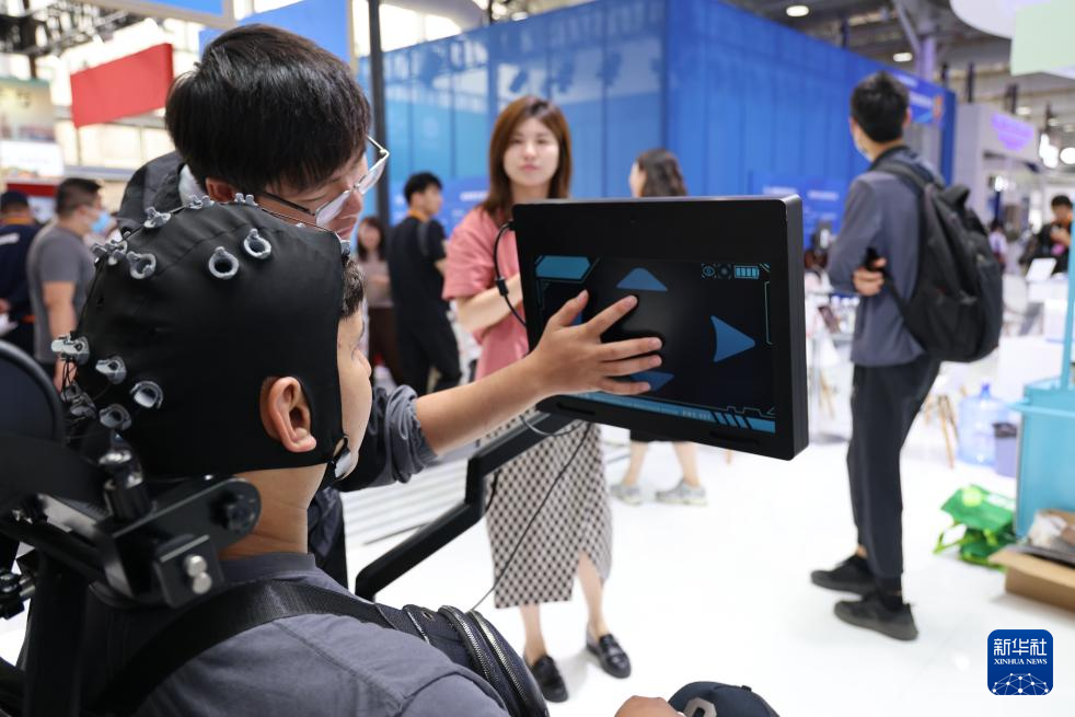 9月13日,工作人员为参观者讲解韶脑科技的脑控神经康复训练机器人。该机器人使用非侵入式脑机接口技术,通过解析使用者脑电波并转换成操控信号,可以让使用者通过机器人进行自主移动。