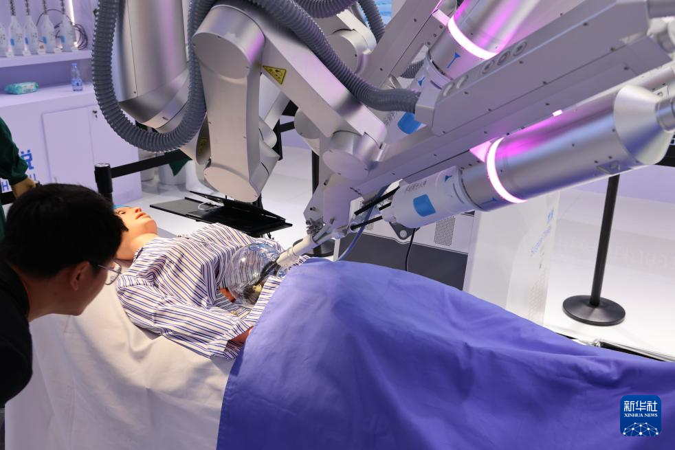 9月13日,参观者在观看术锐单孔腔镜手术机器人剥去一枚鹌鹑蛋的外壳。据了解,该机器人具有单孔超微创、操作灵活有力、视野调整范围大、定位臂安全协动等特点。