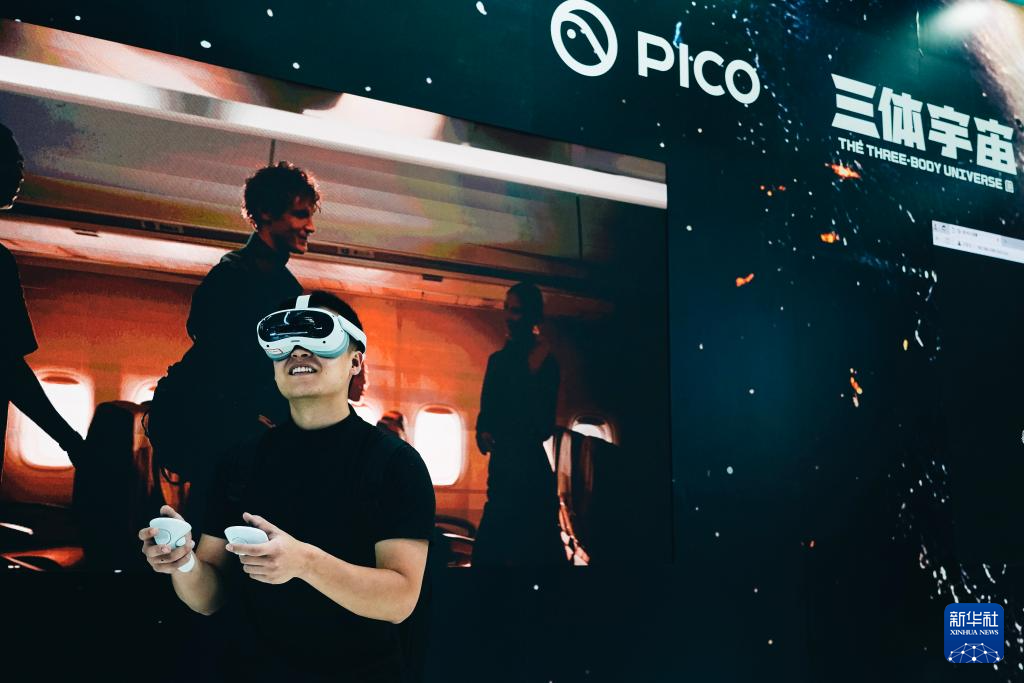 9月12日,在服贸会首钢园区文旅服务专区,参观者使用PICO最新发布的PICO 4 Ultra设备沉浸式体验“三体游戏”。