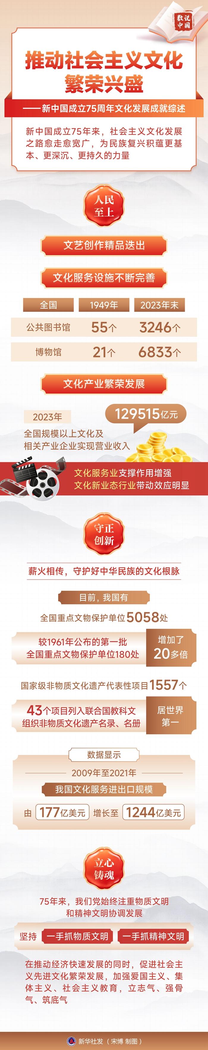 国家之魂,文以化之,文以铸之。75年来,我国着力建设中华优秀传统文化传承发展体系,积极推进文物保护利用和文化遗产保护传承工作,以自信开放的姿态更好推动中华文化走出去,中华文化焕发新的时代光彩。