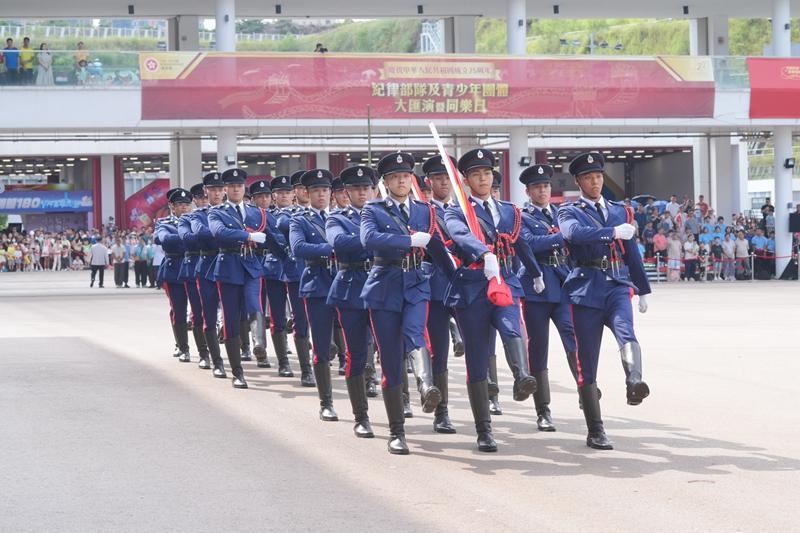 “中国红”映衬着守城卫士的飒爽英姿。香港纪律部队连同青少年制服团体在消防及救护学院举行升旗礼,飞行服务队的直升机在空中敬礼。随后,各部队进行步操汇演及工作车辆巡游,向市民展示守护家园的决心与勇气。