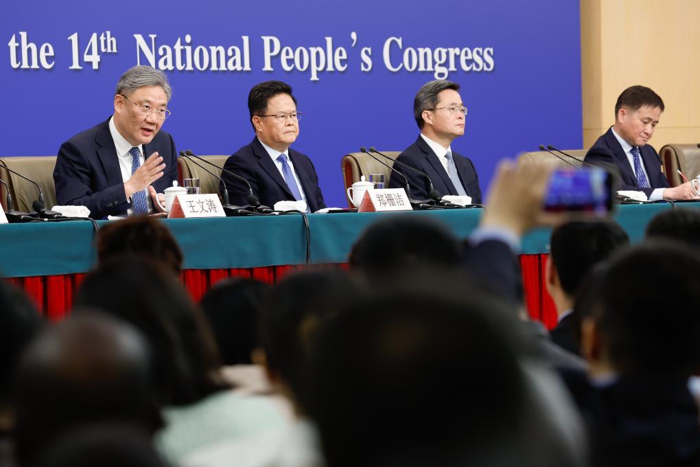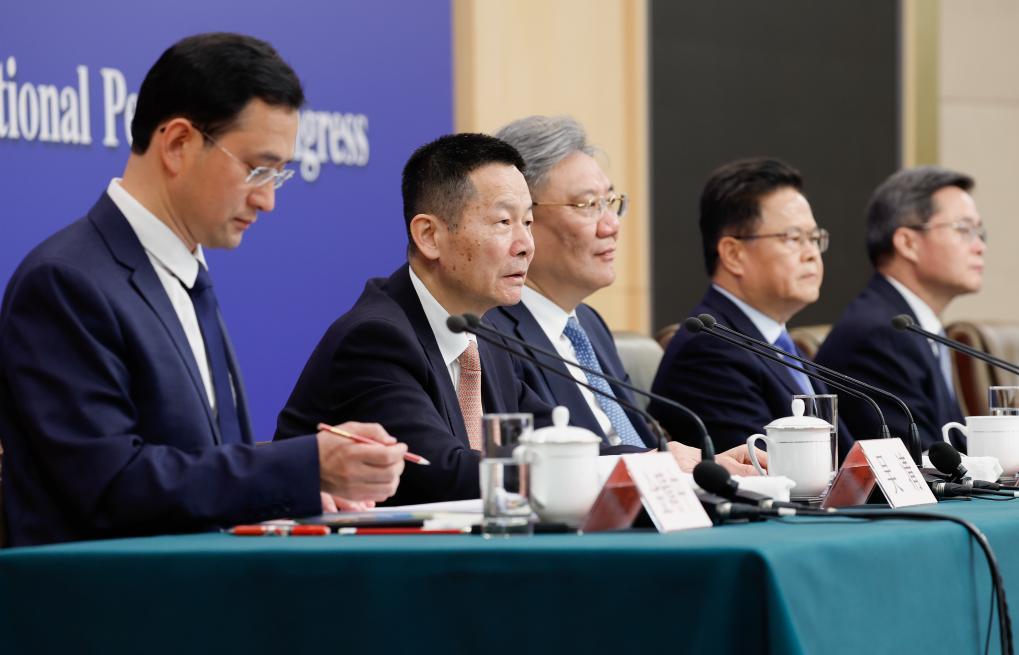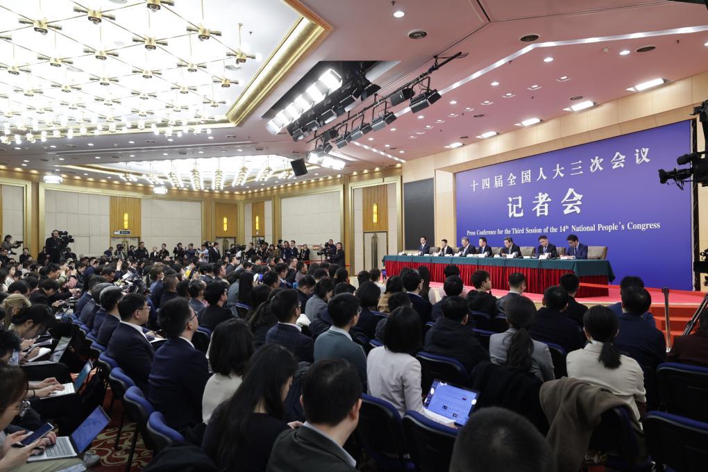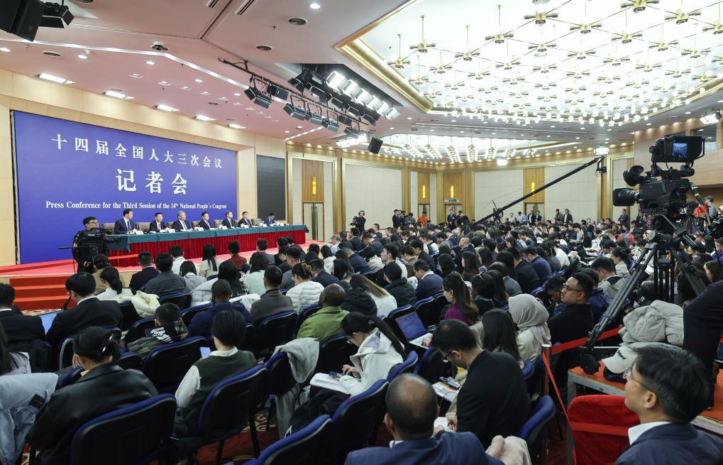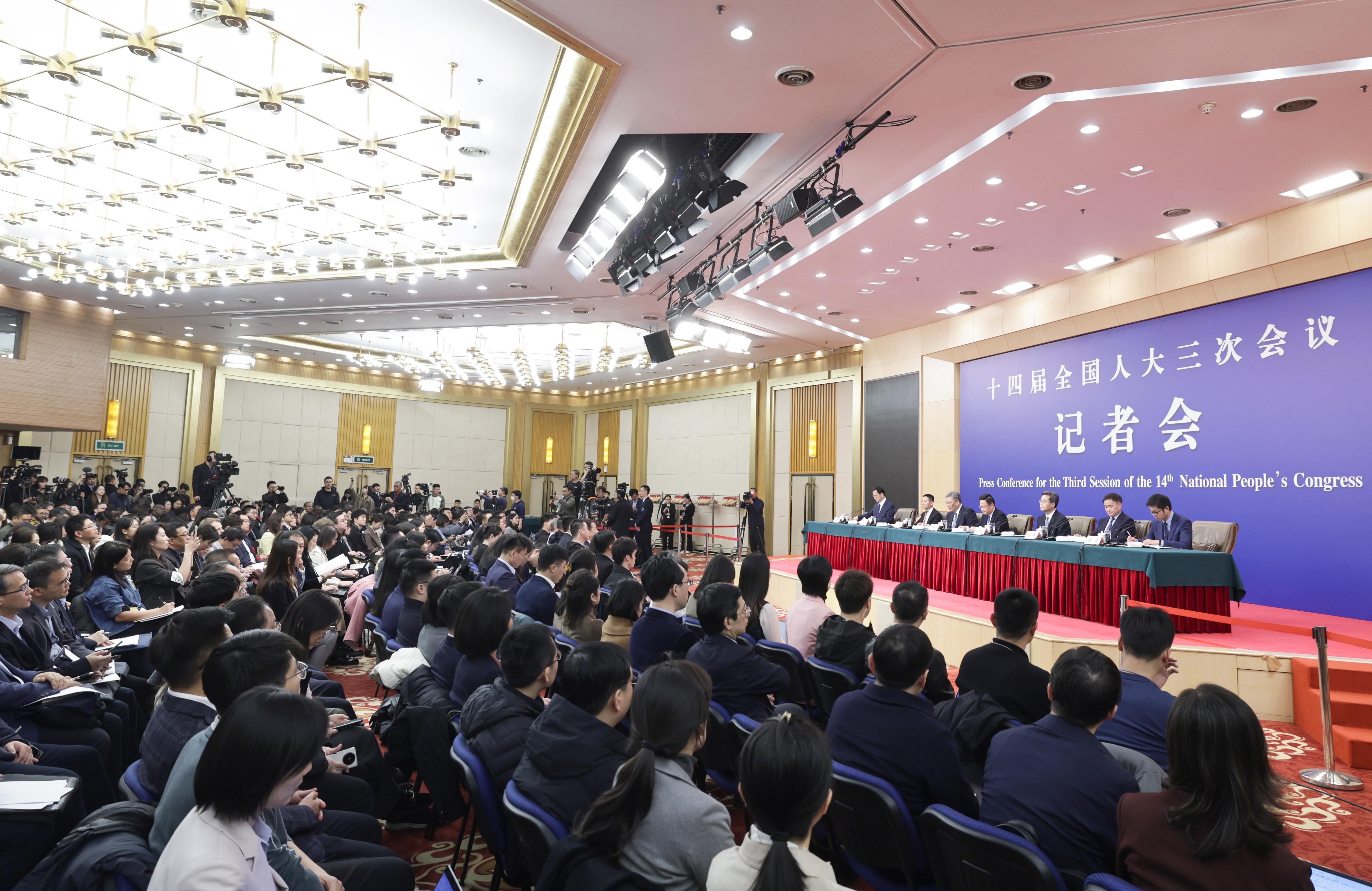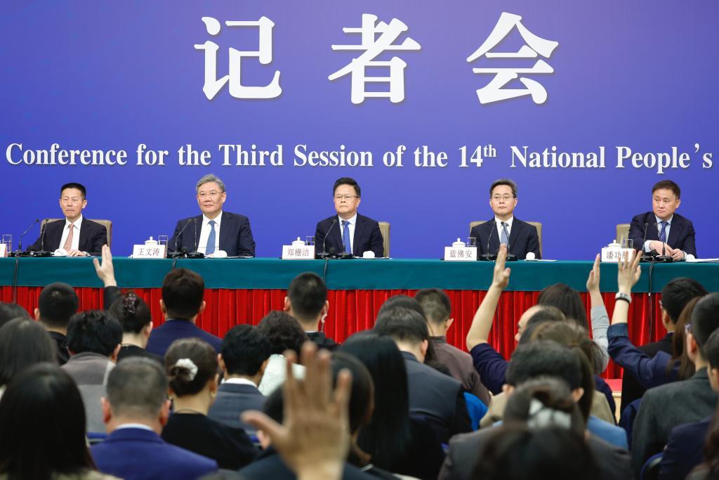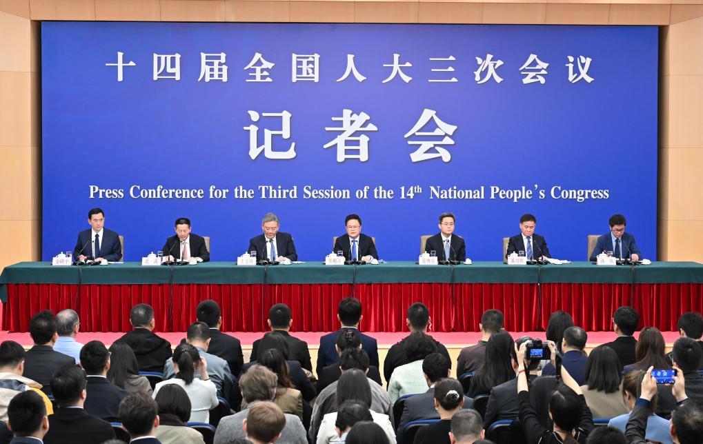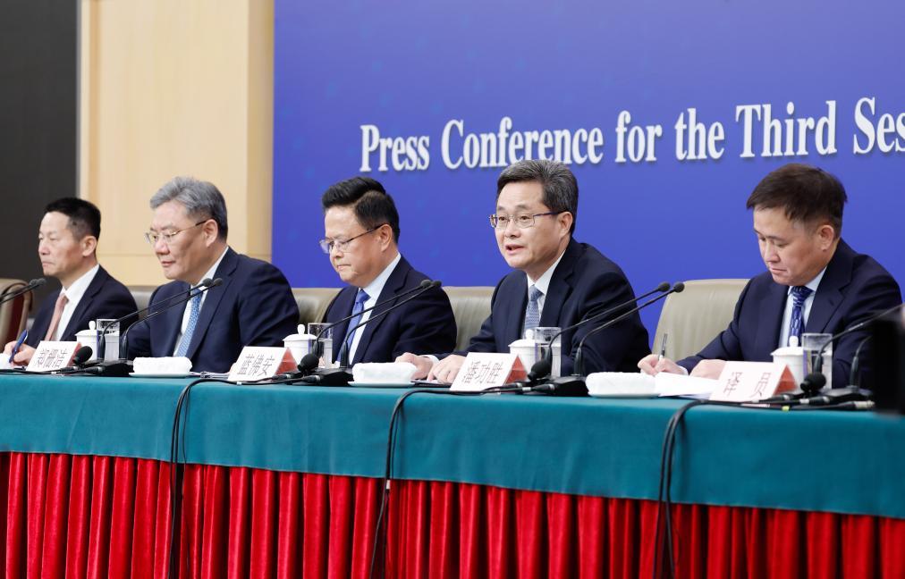3月6日,十四届全国人大三次会议在北京梅地亚中心新闻发布厅举行记者会。国家发展和改革委员会主任郑栅洁、财政部部长蓝佛安、商务部部长王文涛、中国人民银行行长潘功胜、中国证券监督管理委员会主席吴清就发展改革、财政预算、商务、金融证券等相关问题回答中外记者提问。