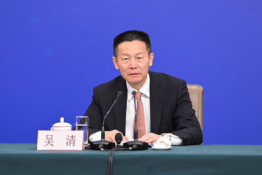 3月6日,十四届全国人大三次会议在北京梅地亚中心新闻发布厅举行记者会。国家发展和改革委员会主任郑栅洁、财政部部长蓝佛安、商务部部长王文涛、中国人民银行行长潘功胜、中国证券监督管理委员会主席吴清就发展改革、财政预算、商务、金融证券等相关问题回答中外记者提问。这是吴清在回答记者提问。