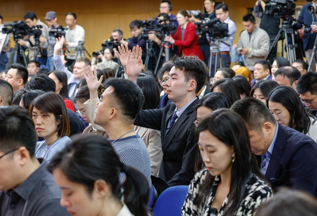 3月6日,十四届全国人大三次会议在北京梅地亚中心新闻发布厅举行记者会。国家发展和改革委员会主任郑栅洁、财政部部长蓝佛安、商务部部长王文涛、中国人民银行行长潘功胜、中国证券监督管理委员会主席吴清就发展改革、财政预算、商务、金融证券等相关问题回答中外记者提问。这是记者举手提问。