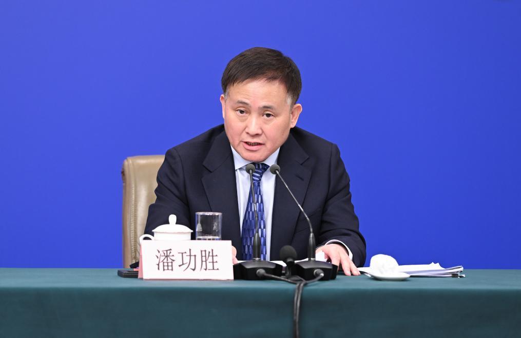 3月6日,十四届全国人大三次会议在北京梅地亚中心新闻发布厅举行记者会。国家发展和改革委员会主任郑栅洁、财政部部长蓝佛安、商务部部长王文涛、中国人民银行行长潘功胜、中国证券监督管理委员会主席吴清就发展改革、财政预算、商务、金融证券等相关问题回答中外记者提问。这是潘功胜在回答记者提问。