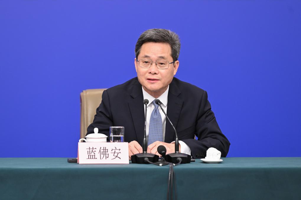 3月6日,十四届全国人大三次会议在北京梅地亚中心新闻发布厅举行记者会。国家发展和改革委员会主任郑栅洁、财政部部长蓝佛安、商务部部长王文涛、中国人民银行行长潘功胜、中国证券监督管理委员会主席吴清就发展改革、财政预算、商务、金融证券等相关问题回答中外记者提问。这是蓝佛安在回答记者提问。