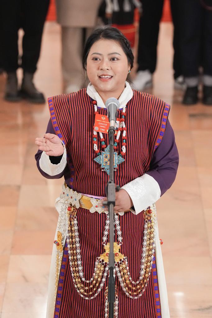 3月10日,全国政协十四届三次会议第三场“委员通道”集体采访活动在北京人民大会堂举行。这是全国政协委员白玛玉珍接受媒体采访。