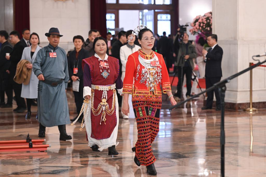 3月10日,全国政协十四届三次会议第三场“委员通道”集体采访活动在北京人民大会堂举行。这是接受采访的全国政协委员入场。