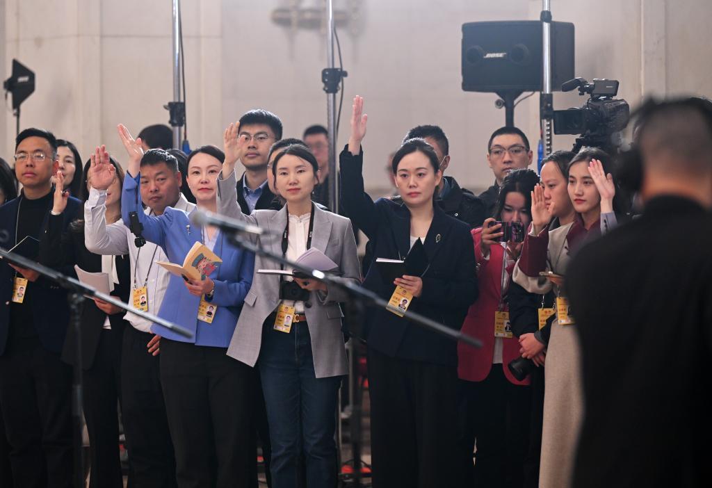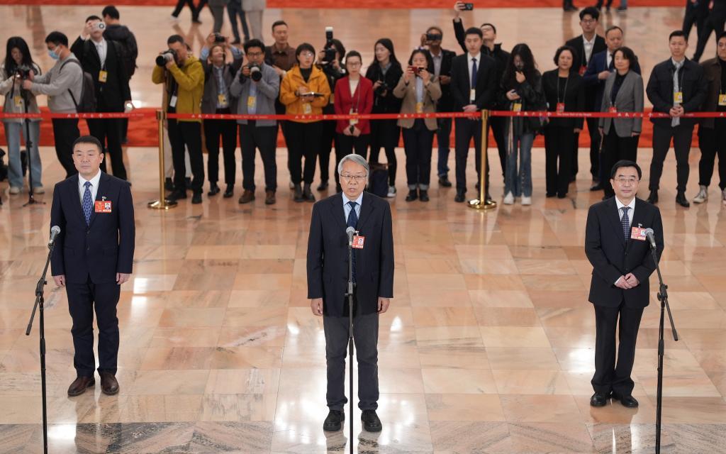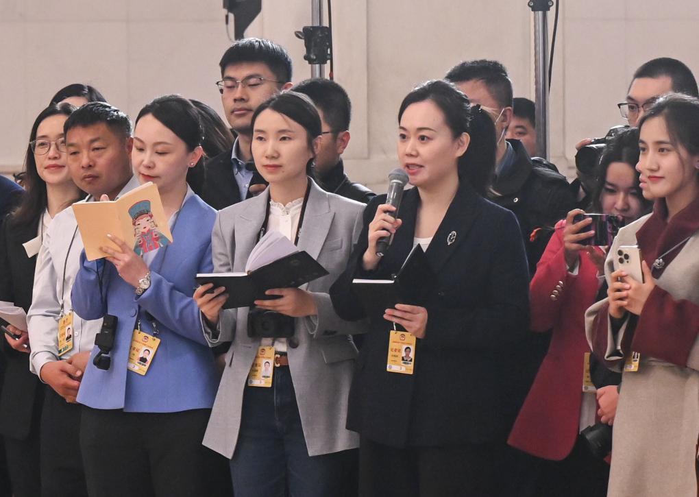 3月10日,全国政协十四届三次会议第三场“委员通道”集体采访活动在北京人民大会堂举行。这是新华社记者在提问。