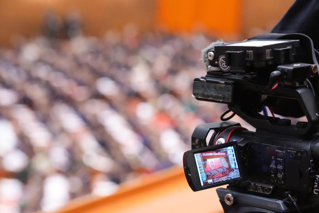 3月11日,十四届全国人大三次会议在北京人民大会堂举行闭幕会。这是记者在闭幕会上采访。