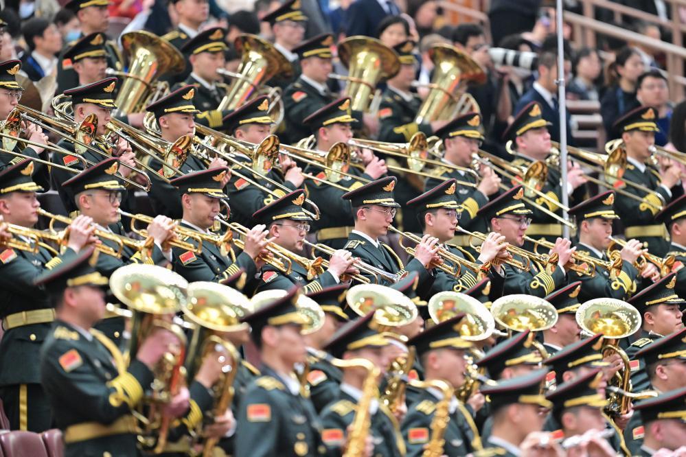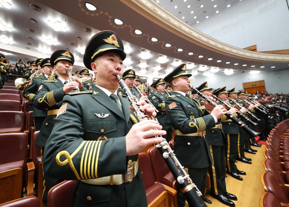 3月11日,十四届全国人大三次会议在北京人民大会堂举行闭幕会。这是军乐团在演奏。