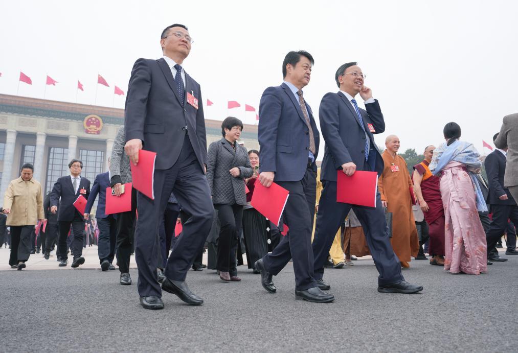 3月11日,十四届全国人大三次会议在北京人民大会堂举行闭幕会。这是闭幕会后,代表们走出人民大会堂。