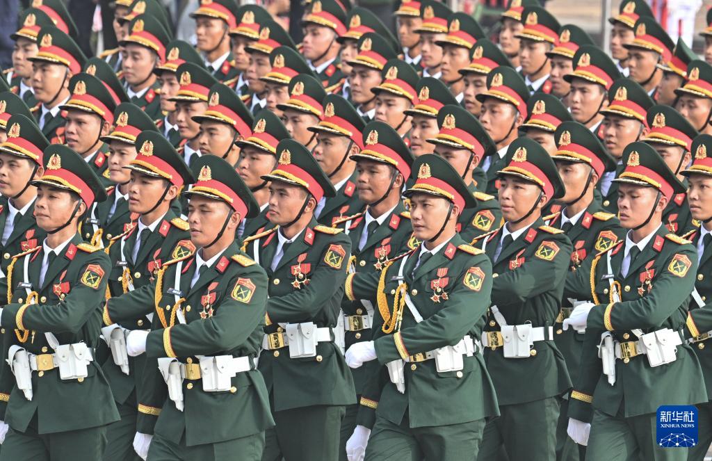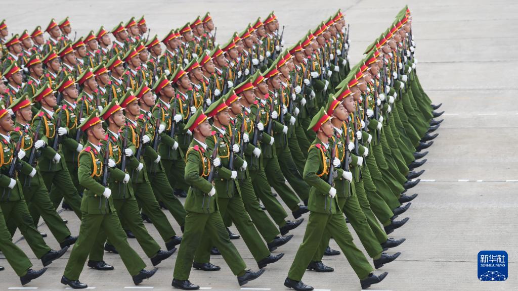 9月2日,在越南河内巴亭广场,越南军队方阵走向主席台接受检阅。新华社记者 胡佳丽 摄
